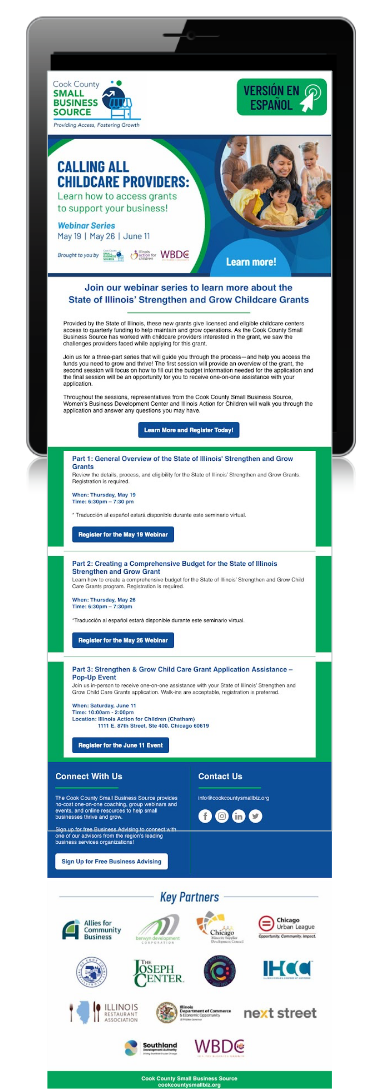 These multi-channel marketing campaigns have resulted in thousands of dollars in small business grants, 6,000+ small businesses engaged in business coaching and over 30,000 engaged with the program.